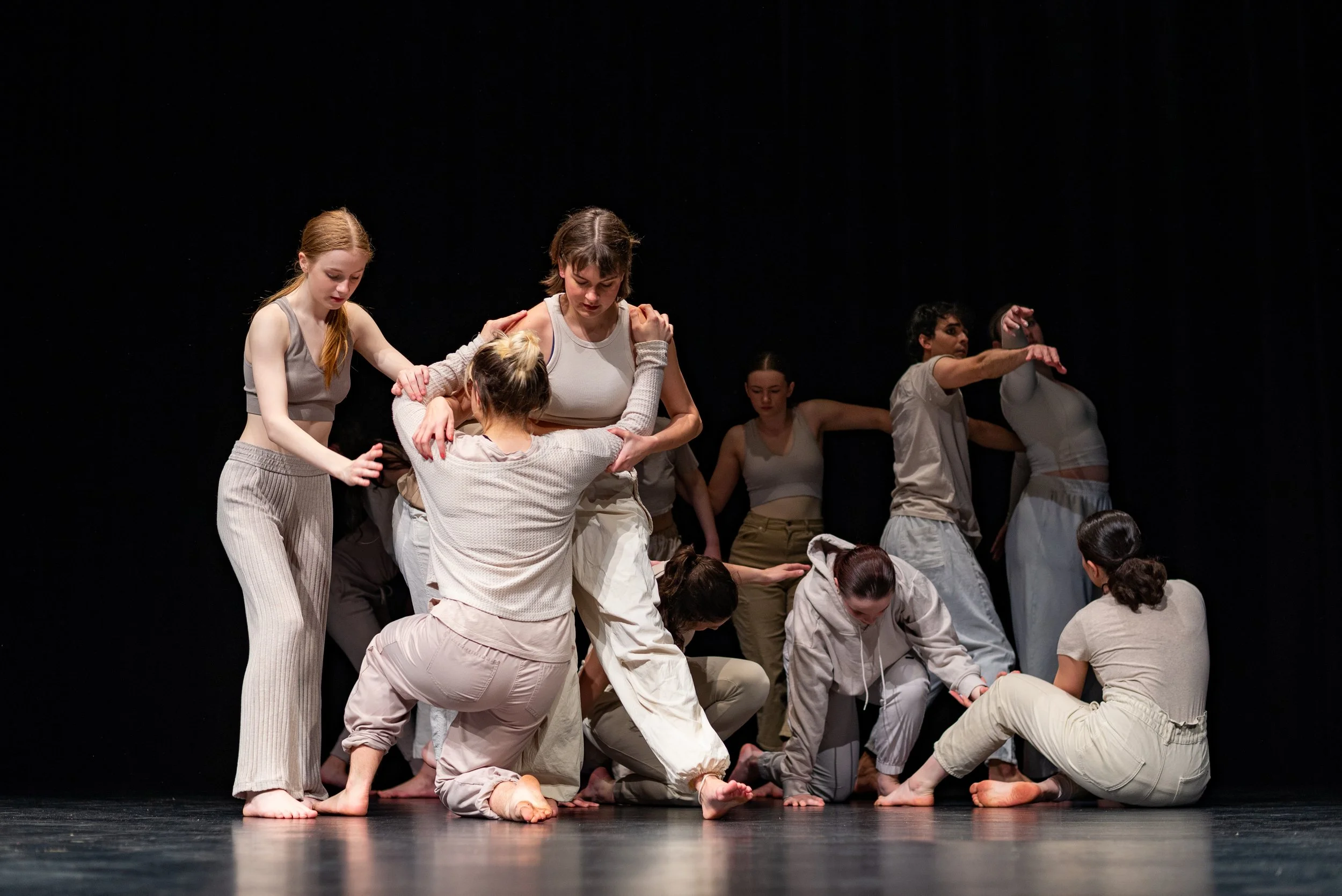 Group of people performing a contemporary dance on stage with black background, some members are standing while others are kneeling or sitting, dressed in neutral-toned casual clothing.